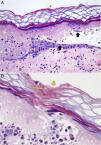 Dermoscopic-pathological correlation of brown dots. (A) Epidermal necrosis with vesicle formation. Melanin is found dispersed into the debris and remnants of pigmented keratinocytes (black arrows). Dermal inflammation with oedema, vasodilatation and erythrocyte extravasation is shown (H&E 100×). (B) Fragments of the tubules of nematocysts are seen in the stratum corneum (yellow arrows) (H&E 200×).