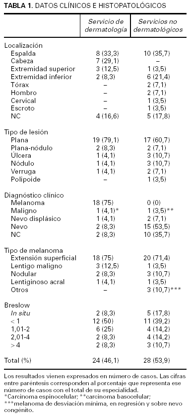 Los dermatólogos extirparon 24 lesiones y los servicios no dermatológicos 28 lesiones (los cirujanos generales extirparon 22; los médicos de familia de atención primaria, tres; el cirujano plástico, dos y extirpó una lesión localizada en el escroto un urólogo).