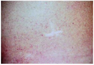 Fig. 1.--Máculas eritematosas algo hiperqueratósicas con distribución bilateral en flancos compatible con angioqueratomas corporis diffusum.
