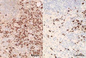 El estudio inmunofenotípico suele poner de manifiesto que las células neoplásicas expresan antígenos linfoides de células B (CD19, CD20, CD22 y CD79a). En ocasiones se detecta un inmunofenotipo B aberrante, caracterizado por la coexpresión de CD43 y CD20. En los linfomas B cutáneos un indicador de clonalidad que se descubre con frecuencia mediante técnicas inmunohistoquímicas es la presencia de una expresión monotípica de cadenas ligeras de las inmunoglobulinas, kappa () o lambda (). En los procesos reactivos la proporción habitual : es 2:1. Una ratio superior a 5-10:1 (restricción ) o una proporción inferior a 0,5-1:1 (restricción ) indican clonalidad (fig. 2) 1,16 .
