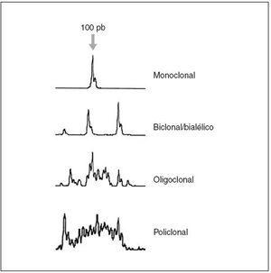 Fig. 3.Patrones de reordenamiento del gen de las cadenas pesadas de las inmunoglobulinas y análisis mediante Genescan.