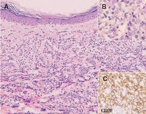 Fig. 9. A) Infiltrado difuso dérmico por células neoplásicas de gran tamaño correspondiente a un linfoma cutáneo B de células grandes de las piernas. (Hematoxilina-eosina, ×100.) B) Detalle de la marcada atipia celular. (Hematoxilina-eosina, ×200.) C) Expresión de CD20 indicando que se trata de células de estirpe B (CD20, ×200).