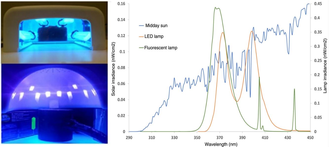 Currently, the use of these UV polymerization lamps is controversial, especially after an article published by Zhivagui et al. in 2023,3 which concluded that acute exposure to the UV light emitted by these lamps resulted in significant damage to the DNA of mouse embryo fibroblasts. These results have raised concerns on the potential carcinogenic risk of long-term exposure to long-wave UV light associated with this cosmetic practice throughout life. This new potential risk to the skin adds to other conditions such as allergic reactions to artificial nail components,4 or other mid- and long-term issues.5,6 However, both the experimental model used (cell cultures) and the doses used by this and other studies vary significantly from the real-world conditions of a nail salon. The doses need to be quantified under real exposure conditions during a manicure session, making such doses more understandable by comparing them to solar exposure in our daily lives.