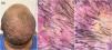 This is the case of a 55-year-old Fitpatrick phototype IV transgender male on androgen hormone therapy. The patient had been on intra-muscular testosterone for over a decade and presented with a several-month history of scalp nodules, abscesses, pruritus, and alopecia on the vertex and mid-scalp (Fig. 1A). Trichoscopy examination was noticeable for broken hairs, pustules, 3D yellow dots, scaling, erythema, polytrichia, and areas with absent follicular openings (Fig. 1B, C).