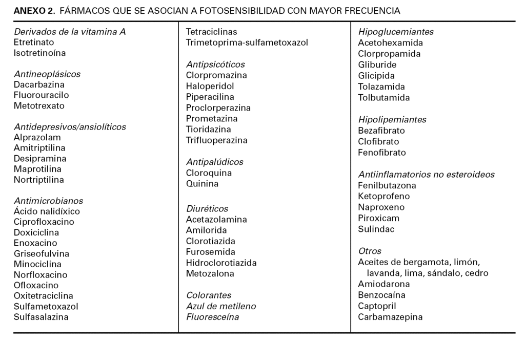 Registro de fármacos con potencial sensibilizante. En estos casos sería recomendable determinar la DFM de forma previa al inicio del tratamiento. Si esto no es posible, se recomienda iniciar la pauta terapéutica con dosis de 0,5 J/cm 2 e incrementos cada dos sesiones.