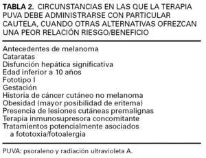 La terapia PUVA deberá evitarse en aquellos pacientes con trastornos graves en los mecanismos de reparación del ADN (xeroderma pigmentoso, síndrome de Bloom), cuando exista riesgo elevado de desarrollar neoplasias cutáneas malignas agresivas (p. ej., síndrome del nevo displásico familiar) o cuando la exposición a la radiación ultravioleta sea un conocido agravante de una enfermedad subyacente del individuo (lupus eritematoso). Se ha propuesto de forma arbitraria la edad de 10-12 años como límite inferior para la indicación de la terapia PUVA, con el objetivo de minimizar la posibilidad de carcinogénesis y el desarrollo de cataratas durante la edad adulta. Sin embargo, resulta aceptable escoger esta alternativa cuando el riesgo asociado a otras posibilidades terapéuticas sea mayor. No existe evidencia de que la terapia PUVA tenga riesgo teratógeno, aunque en el embarazo se escogerá de ser posible el tratamiento con UVB 38. La terapia PUVA se ha demostrado segura en los pacientes infectados por el virus de la inmunodeficiencia humana 39. En la tabla 2 se listan aquellas circunstancias en las que la terapia PUVA se escogerá sólo cuando, una vez evaluadas las diferentes alternativas terapéuticas disponibles, sea aquélla la que ofrece un mejor equilibrio entre riesgo y beneficio y debe administrarse, en cualquier caso, con especial cautela. En la tabla 3 se resumen los puntos que deberán tenerse en cuenta de forma previa al inicio de la terapia PUVA.
