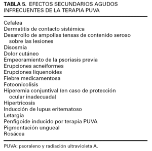 Los efectos secundarios a corto y en particular a largo plazo representan la principal limitación de la terapia PUVA. De la capacidad de prevenir y tratar de forma adecuada estos efectos adversos depende en gran medida el mantenimiento de una adecuada relación riesgo-beneficio en esta alternativa terapéutica.