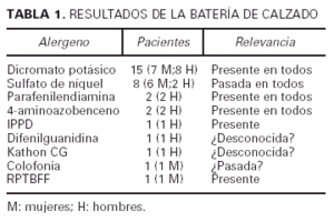 Los resultados de las pruebas epicutáneas realizadas fueron los siguientes: en esos 18 pacientes se encontraron 32 positividades en la batería de calzado y 41 en la estándar. Doce de estos pacientes (67%) tenían más de una positividad en la batería de calzado. En esta batería de calzado (tabla 1) el alergeno más frecuentemente encontrado fue el dicromato potásico, en 15 pacientes (83%), con relevancia actual en todos; el segundo más frecuente fue el sulfato de níquel en 8 enfermos (44%), aunque con relevancia pasada en todos; en 2 pacientes (11%) aparecieron positividades a gomas: isopropilfenilfenilendiamina y difenilguanidina con relevancia actual; en 2 pacientes (11%) se encontraron positividades a colorantes: parafenilendiamina y 4-aminoazobenceno, también con relevancia presente en todos; la colofonia, usada como adhesivo y puede que también en betunes, fue positiva en un paciente (5,5%), aunque consideramos que la relevancia era pasada o dudosa; la resina de p-tert-butifenolformaldehido también fue positiva en otro enfermo (5,5%), lo consideramos como relevancia presente, y el Kathon CG, que se emplea como biocida, fue también positivo en un paciente (5,5%), con relevancia desconocida.