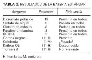 Los resultados de la batería estándar pueden verse en la tabla 2; el alergeno más frecuente también fue el dicromato potásico encontrado también en 15 pacientes (83%). Comparando los resultados de la batería estándar y la de calzados, sólo en un paciente (5,5%), el que presentó positividad a la difenilguanidina, no se encontraría uno de los alergenos responsables de su cuadro, pero este paciente presentaba también reacción al dicromato; todos los demás podían ser diagnosticados sólo por la batería estándar. Encontramos otras discordancias comparando los resultados de las dos baterías; así con la batería estándar encontramos 3 positividades a la parafenilendiamina, mientras que con la del calzado sólo encontramos 2; aunque la paciente que era negativa, según la batería de calzado, a la parafenilendiamina era positiva a dicromato, encontrando también alergeno responsable de su cuadro clínico; también en los resultados a RPTBFF encontramos 3 positividades, una dudosa, según la batería estándar y sólo una en la batería de calzado, pero en los 2 pacientes en los que fue negativa la resina paratertbutilfenolformaldehido (RPTBFF) encontramos en la batería de calzado otros alergenos que nos pueden también explicar la clínica, en un paciente colorantes y en otro dicromato.