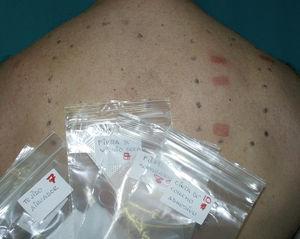 Fig. 1.--Positividad a los productos propios del paciente en la lectura a las 168 h de las pruebas epicutáneas.
