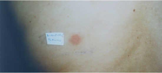 Fig. 2.—Caso 2. Lectura a las 96 h: parche alérgico positivo por disulfuro de dialilo.