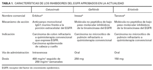Las dosis habituales son de 250 mg/día vía oral de gefitinib 3, 150 mg/día vía oral para erlotinib e infusiones intravenosas semanales con cetuximab a dosis de 400 mg/m 2 la primera semana y 250 mg/m 2 el resto (tabla 1).