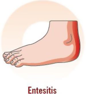 | Dolor junto a la articulación; hinchazón en el punto del dolor; limitaciones funcionales; anamnesis de fascitis plantar; dolor en las entesis (tendón de Aquiles, fascia plantar, tendón del cuádriceps, ligamento rotuliano, cresta ilíaca); más frecuente en las extremidades inferiores que en las superiores |