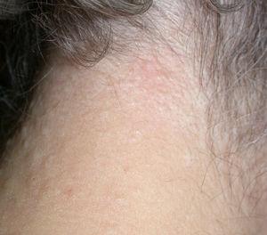 Una mujer de 76 años con hipercolesterolemia y diverticulosis en colon consultó por la aparición desde hacía un año de unas pápulas asintomáticas de coloración amarillenta en las caras laterales y posterior del cuello. Las pápulas no eran foliculares y se agrupaban en placas con aspecto en empedrado (fig. 1). Las axilas y los espacios supraclaviculares no estaban afectados, y no se observaban otras lesiones de daño actínico en cuello, cara o escote. La paciente negaba exposiciones prolongadas al sol o procesos inflamatorios cutáneos en la zona afectada. Ningún familiar presentaba lesiones similares.
