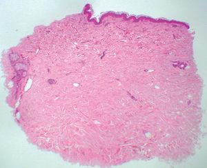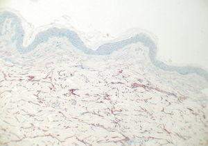 En la biopsia cutánea teñida con hematoxilina-eosina sólo se observó una leve atrofia de la epidermis, sin cambios visibles en la dermis (fig. 2). La tinción con orceína demostró una pérdida de fibras elásticas en la dermis papilar, con un discreto aumento de fibras elásticas en la dermis subpapilar (fig. 3). No se observaron alteraciones en la cantidad o disposición de las fibras elásticas en el resto de la dermis. No se detectaron depósitos de calcio con la tinción de von Kossa.
