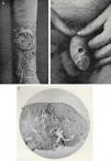 La «piodermitis chancriforme» había sido descrita por Covisa y Bejarano6 al observar 2 niños varones con lesiones en prepucio similares al chancro primario de la sífilis. Posteriormente se encontraron con lesiones similares tanto en varones adultos (fig. 5B) como en mujeres y niñas, y en múltiples localizaciones extragenitales. En todos los casos los intentos por encontrar treponemas fueron infructuosos y las serologías de los pacientes negativas; otro dato importante en el diagnóstico diferencial era la ausencia de células plasmáticas en el infiltrado, fundamentalmente constituido por polimorfonucleares (fig. 5C). El germen implicado más frecuente era el estafilococo, comprobado por frotis directos de las lesiones. Una vez más este cuadro descrito inicialmente por autores españoles tuvo poca repercusión en la literatura internacional.