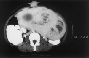Fig. 1.--TC que muestra una pelvis ocupada por una masa de gran tamaño.