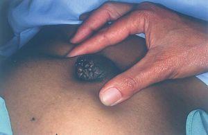 El diagnóstico diferencial es amplio y debe incluir desde lesiones benignas como hernias19,20, restos embriológicos (onfalomas, onfaloceles, quiste del uraco, pólipos del conducto onfalomesentérico), granuloma piógeno, granuloma por cuerpo extraño (talco, candidiásico), hasta procesos malignos como melanoma, metástasis de neoplasias internas (adenocarcinomas de ovario, carcinoma gástrico)4,21. La microscopia de epiluminiscencia22 encuentra una pigmentación roja periférica que se difumina y centralmente estructuras globulares profundas (red atolls), que ayuda a establecer el diagnóstico diferencial con el melanoma.