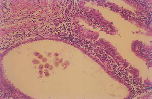 El estudio histopatológico encuentra glándulas en la estroma celular en la que se aprecia extravasación hemática. Las luces glandulares pueden ser redondas, alargadas o anguladas, pueden contener detritos celulares, eritrocitos y un material amorfo PAS (ácido peryódico de Schiff) y azul alcián positivo. Se localizan en dermis y/o tejido celular subcutáneo. Al igual que el endometrio, los hallazgos histopatológicos pueden variar según las distintas fases del ciclo menstrual. De este modo, en la fase proliferativa existe una pronunciada actividad mitótica, que confiere al epitelio un aspecto pseudoestratificado. En la fase secretora se aprecia una secreción por decapitación de las células glandulares. En esta fase suelen evidenciarse dos tipos celulares en la estroma: una célula grande de citoplasma amplio y otra célula clara de menor tamaño, que equivaldrían a las células predeciduales y al granulocito endometrial. Finalmente, en la fase menstrual, es típica la desintegración del epitelio glandular. Sin embargo, no suele existir una buena correlación entre los cambios histológicos de la endometriosis y la fase del ciclo menstrual en que se halle la paciente4,15-17. Incluso se pueden observar glándulas en distintas fases del ciclo menstrual en una misma paciente17. En casos dudosos la presencia de receptores estrogénicos en las células del epitelio glandular apoyará el diagnóstico de endometriosis18.