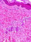 Clínica cutáneaEn estos pacientes también es característica la presencia de una erupción urticariforme migratoria y no pruriginosa, destacando que a diferencia de lo que ocurre en las otras criopirinopatías las lesiones permanecen durante toda la vida y no se relacionan con desencadenantes claros, como el frío (fig. 2). La biopsia de estas lesiones muestra un infiltrado inflamatorio mixto, compuesto de linfocitos, neutrófilos y eosinófilos, con distribución perivascular superficial y profunda, junto a una hidradenitis neutrofílica ecrina5 (fig. 3).