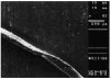 FIG. 8.--Microscopia electrónica de barrido: pelo con rotación de 180°, aplanamiento y zona con acanalamiento central a la izquierda de la imagen.