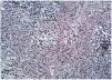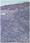 La biopsia de una lesión reciente, localizada en muslo izquierdo, reveló un infiltrado neutrofílico masivo y polvillo nuclear ocupando difusamente toda la dermis desde el cuerpo papilar hasta la hipodermis (fig. 6). En el seno del infiltrado neutrofílico se podían encontrar algunos vasos con necrosis fibrinoide de la pared (fig. 7). La inmunofluorescencia directa fue negativa. Los cultivos de una porción de biopsia para bacterias, hongos y micobacterias no revelaron crecimiento patógeno.