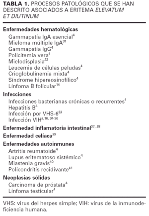 El EED se asocia, con frecuencia, a diversos problemas médicos, especialmente anomalías hematológicas. La asociación con gammapatía o mieloma del tipo IgA parece algo más que un hallazgo casual: en alguna serie4 el 31% de los pacientes con EED tenía además una gammapatía monoclonal IgA de tipo esencial. Si bien otras dermatosis neutrofílicas comparten esta asociación, el vínculo con el EED es más fuerte. Otras afecciones descritas en asociación con el EED se resumen en la tabla 1. La variedad de enfermedades asociadas podría tener como mecanismo patogénico común, para dar origen al EED, diversas situaciones en que con facilidad se produce la formación de inmunocomplejos, ya sean condiciones de exceso de exposición a antígenos (infecciones crónicas, enfermedad inflamatoria intestinal), como situaciones en que circulan altos niveles de anticuerpos (paraproteinemias, enfermedades autoinmunes)38. En muchos casos el EED precede al diagnóstico de las enfermedades asociadas.