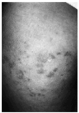 Mujer de 31 años, fumadora de 30 cigarrillos al día. Acudió a la consulta de Dermatología por presentar, desde hacía 5 años, coincidiendo con la época invernal, brotes de lesiones pruriginosas en cara superoexterna de muslos, que desaparecían en la primavera, dejando una hiperpigmentación residual. Entre sus antecedentes personales destacaba que la paciente no disponía de calefacción central en su vivienda y utilizaba a diario pantalones vaqueros ajustados. A la exploración física observamos lesiones eritematovioláceas, papulosas, que en determinadas zonas confluían formando placas con una superficie descamativa; alrededor de las mismas se apreciaban signos de queratosis pilar (fig. 1). A la palpación notamos la presencia de lesiones nodulares y una menor temperatura en la zona afecta. El resto de la exploración física fue normal.