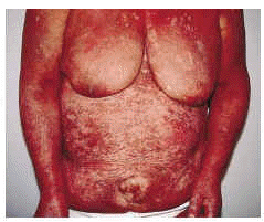 La tendencia a la generalización de la afectación cutánea está bien establecida en la dermatomiositis, y no es infrecuente encontrar, además de las clásicas pápulas de Gottron y del eritema heliotropo, eritema y descamación en áreas fotoexpuestas como la zona «V» del cuello, hombros y parte superior de la espalda, la cara y zonas extensoras de los antebrazos.