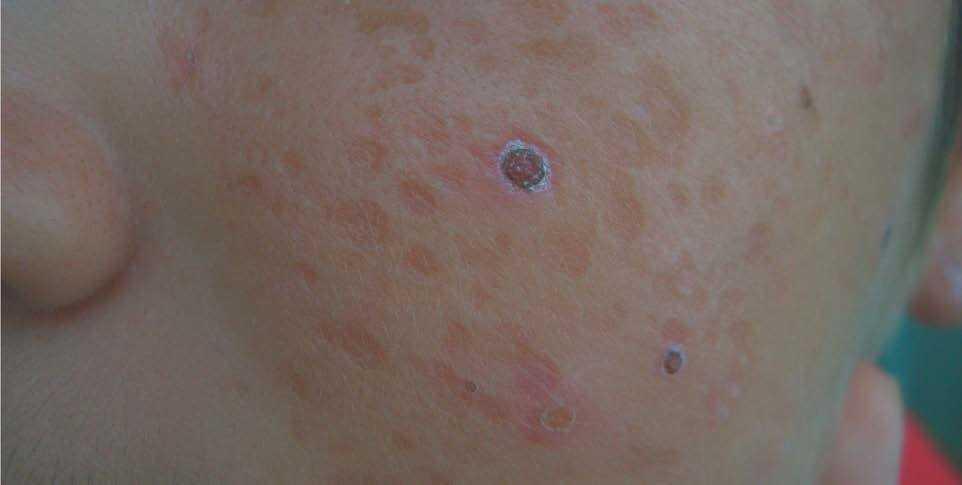 Un varón de 10 años de edad, sin antecedentes personales ni familiares de interés, consultó por brotes recurrentes de lesiones en zonas fotoexpuestas, de 3 años de evolución, que aparecían sobre todo en los meses estivales.
