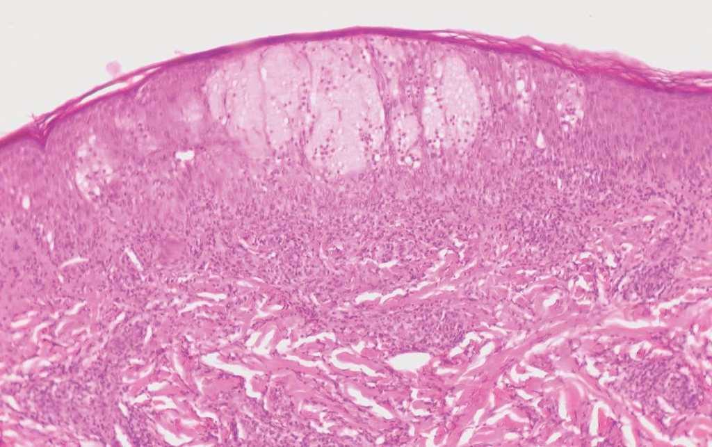 El estudio histológico es característico7, apareciendo en fases iniciales una vesícula intraepidérmica con un infiltrado en dermis de neutrófilos y linfocitos. En estadios más tardíos se observan, además, agregados de queratinocitos necróticos. En casos severos se han llegado a describir cambios de vasculitis y paniculitis. El estudio de inmunofluorescencia directa es negativo, dato que puede servir para el diagnóstico diferencial.