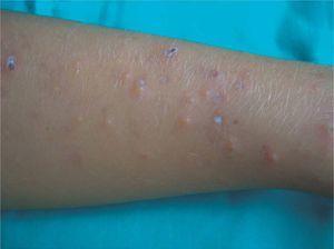 A la exploración física, el paciente presentaba lesiones polimorfas en la cara, las orejas y los antebrazos. Se observaban vesículas de contenido seroso de unos 2 mm de diámetro (fig. 1), costras y un gran número de cicatrices deprimidas de aspecto varioliforme (fig. 2).