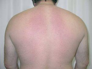 Fig. 1.--Afectación bilateral y simétrica de la parte alta de la espalda en forma de grandes placas induradas eritematosas.