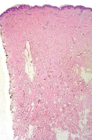 Fig. 2.--El estudio histopatológico mostró un engrosamiento de la dermis reticular con fibras de colágeno ensanchadas y separadas entre sí. (Hematoxilina-eosina, x10.)