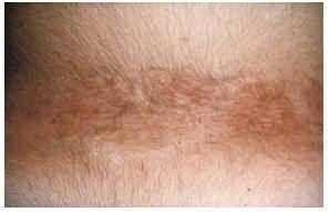-- En la región lumbosacra se sitúan de forma característica las placas chagrin (fig. 4), carac- terizadas por ser áreas de piel ligeramente elevada, amarillenta, de tacto similar a la lija, cuyo tamaño oscila entre 1 y 5 cm de diámetro y que en ocasiones se rodean de otras más pequeñas. La histología muestra la disposición esclerótica del colágeno en dermis profunda de manera similar a la morfea. Suele existir disminución y fragmentación de fibras elásticas.