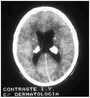 Las manifestaciones tumorales son hamartomas tuberosos múltiples, bien delimitados, con potencial blastomatoso, benigno o maligno que se encuentran a nivel de corteza cerebral y más raramente en cerebelo o en médula espinal. Su transformación maligna puede conducir a astrocitomas de células gigantes y glioblastomas con sintomatología de expansión intracraneal: hipertensión, cefaleas, vómitos, alteraciones visuales y papiledema. El electroencefalograma (EEG) está alterado en el 80% de los pacientes, pero las anomalías encontradas no son específicas de la enfermedad. El líquido cefalorraquídeo (LCR) es normal o, como mucho, puede presentar una ligera elevación de las proteínas. En los estudios radiológicos simples se pueden observar calcificaciones de los ganglios de la base o paraventriculares (fig. 7) y en la TAC o en la RMN cerebral tubérculos corticales, nódulos subependimarios, lesiones en la materia blanca periventricular profunda, etc.