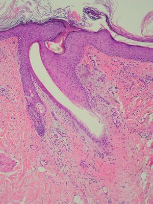 Fig. 2.--Extravasación hemática en la dermis, con focos de infiltrado perivascular de predominio linfomononuclear y pelo enroscado, con adelgazamiento focal del epitelio anexial. (Hematoxilina-eosina, x200.)