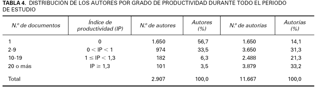 Mil seiscientos cincuenta autores (56,7 %) de los 2.907 recogidos durante el periodo, tuvieron un IP = 0, es decir, firmaron un único documento, lo que da un valor para el índice de transitoriedad (porcentaje de autores con un solo trabajo) de 56,7 %. A 101 autores (3,5 %) se les consideró máximos productores por haber firmado más de 20 trabajos (tabla 4).