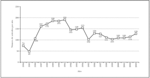 Al dividir los 20 años del estudio en dos periodos de 10 años, encontramos que la producción total de artículos fue menor en el segundo periodo. De los 1.416 (54,4 %) trabajos del primer decenio se pasó a 1.188 (45,6 %) en el segundo.