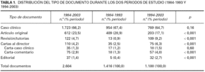 La menor producción de documentos en el segundo periodo del estudio (se pasó de 1.416 documentos a 1.188) tuvo lugar a partir de la remodelación de la revista en julio de 1994 (tal como se explicó en el apartado de material y métodos). El cambio en el comité de redacción conllevó la inclusión de un menor número de documentos por ejemplar, lo que se tradujo en una reducción del número de páginas, pero a su vez aportó una mejor clasificación de los artículos al incluir éstos en secciones diferentes. Por tanto, la evolución global de la producción de la revista es difícilmente valorable por los cambios ocurridos en su formato, aunque podemos concluir que a partir de éste, la producción anual de la revista no ha sufrido excesivas variaciones.