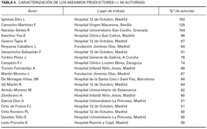 Durante todo el periodo aportaron documentos un total de 293 centros diferentes. De ellos, 55 instituciones firmaron más de 10 colaboraciones cada una, lo que representó un total de 2.409 colaboraciones (80,9 % del total de colaboraciones). Cincuenta y tres de los 55 centros con mayor producción representaban a grandes hospitales o complejos hospitalarios, lo que da idea de la gran trascendencia de la red hospitalaria como marco investigador. El hospital que aportó un mayor número de documentos fue, con diferencia, el Hospital Universitario 12 de Octubre (n = 281), al que pertenece también el primer productor del estudio, Iglesias Díez L. A pesar de la aparente escasa presencia de la universidad, recordemos que la mayoría de los principales centros productores son hospitales universitarios y, por tanto, puede considerarse implícita cierta participación de la universidad.