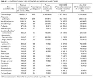 A lo largo de todo el periodo de estudio se contabilizó un total de 3.966 colaboraciones (o apariciones de especialidad). De éstas, 3.946 pertenecían a 47 especialidades médicas distintas (incluyendo laboratorios farmacéuticos). Hubo 19 firmas pertenecientes a áreas departamentales no relacionadas con la medicina (0,5 % de colaboraciones) y en un artículo no constó el área departamental.
