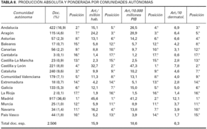 La tabla 8 muestra la producción absoluta y ponderada de cada comunidad autónoma. Si relativizamos la producción de cada comunidad por el número de habitantes podemos observar que Madrid mantuvo el primer puesto que ocupaba al analizar la producción absoluta. Las siguientes comunidades con mayor producción ponderada por habitantes fueron Castilla y León (la cuarta en cifras absolutas), Aragón y Navarra. Cuando la ponderación se realizó por PIB la comunidad mejor clasificada fue Castilla y León, seguida de Madrid, Aragón y Andalucía. Al ajustar la producción por el número de dermatólogos de cada comunidad, Madrid mantuvo el liderazgo como primera comunidad productora y le siguieron Castilla y León, Andalucía y Asturias.