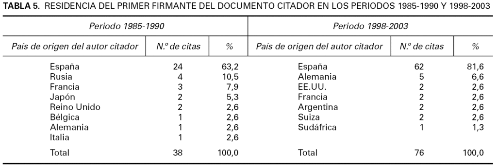 España fue, con diferencia, el país que más citas emitió, con el 81,6 % (tabla 5). La contribución de autores de otras nacionalidades fue muy escasa, y destacan con 5 citas los autores alemanes. Estados Unidos, Francia, Argentina y Suiza aportaron cada uno 2 citas y Sudáfrica aportó una. De las 62 españolas, 24 lo fueron en forma de autocita, por lo que el porcentaje de autocitación de este periodo fue del 31,6 %.