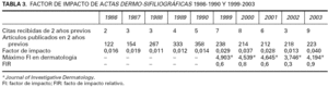 Como muestra la tabla 3, el FI entre los años 1999 y 2003 fue superior al obtenido para el primer periodo del estudio, y oscilaba entre el 0,013 de 2002 y el 0,040 de 2003. Al relativizar este resultado por el máximo FI en dermatología obtenido por la revista Journal of investigative dermatology, se ve que el año 2003 sigue siendo el de mayor FI para AD.