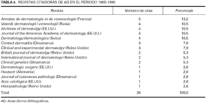 El patrón de citación de AD durante el periodo estudiado mostró una considerable dispersión de las revistas fuente o citadoras (tabla 4). Las 38 citas que recibió AD entre 1985 y 1990 (por artículos publicados entre 1984-1989) se originaron en 15 revistas diferentes. La revista que más veces citó a AD fue la publicación francesa Annales de dermatologie et de venereologie (5 citas). Le siguieron las revistas Vestnik dermatologii i venerologii, Archives of dermatolgy, Journal of the American Academy of Dermatology y Dermatology con 4 citas cada una. Las 10 revistas restantes aportaron entre 3 y 1 cita cada una. Un total de 12 de las revistas fuente eran publicaciones de la especialidad, dos lo eran de histopatología y una de genética.