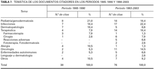 El tema que se trató en un mayor número de documentos citadores de AD fue el de pediatría y genodermatosis (8 citas), seguido de infecciones (7 citas) y dermatopatología (7 citas) (tabla 7).