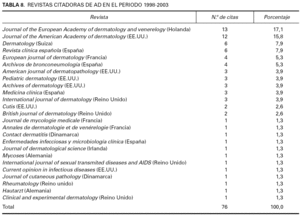 Entre 1998 y 2003 la revista AD fue citada (por artículos que había publicado entre 1997 y 2002) en 76 ocasiones (tabla 8). La fuente de estas citas fueron 25 revistas y destacaron 2 publicaciones pertenecientes a las Academias de Dermatología Europea y Americana. Nos referimos a la revista publicada en Holanda Journal of the European Academy of Dermatoly and Venérelogy y a la revista americana Journal of the American Academy of Dermatology, que emitieron 13 y 12 citas, respectivamente. Ambas aportaron el 33 % del total.