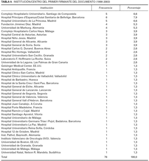 Los primeros firmantes de los documentos citadores de AD pertenecían a 42 centros diferentes (tabla 9). De éstos, 33 eran centros españoles y 9 extranjeros. En la tabla 9 se presenta la distribución de citas para cada uno de estos centros.