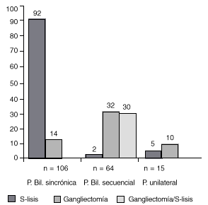 FIG. 1.--Distribución de 185 procedimientos quirúrgicos realizados a 100 pacientes. Se llevaron a cabo 71 gangliectomías (exéresis de ganglio simpático) y 114 simpaticólisis (S-lisis). Los procedimientos se realizaron de forma unilateral (P. unilateral) en 15 casos, bilateral en un tiempo (P. Bil. sincrónica) en 106 casos y de forma secuencial (P. Bil. secuencial) en 64.